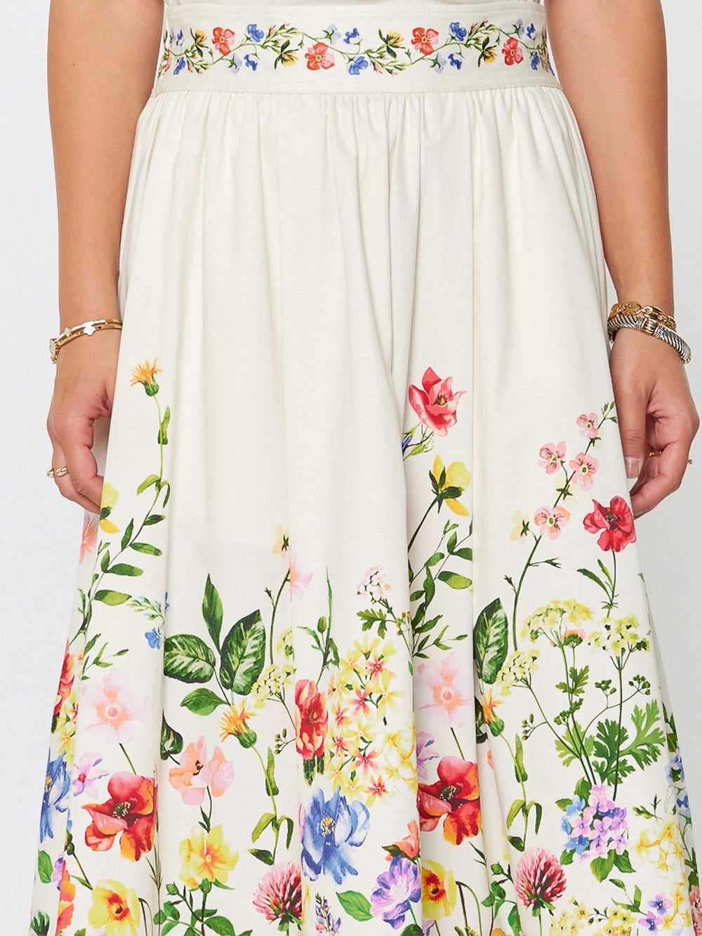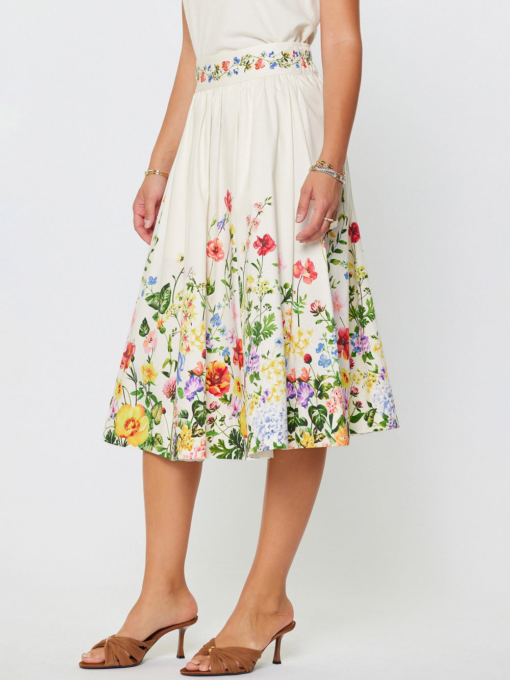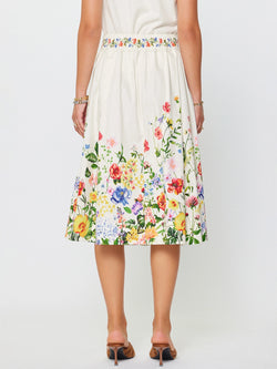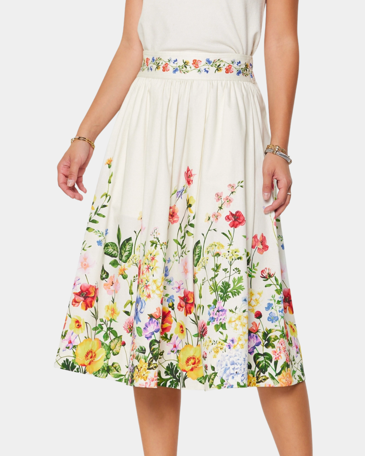 Twirl-worthy A-line midi skirt bursting with vibrant florals. The elasticated back waistband keeps you comfy all day long, whether you're running errands or dancing the night away. Perfect for adding a pop of color to any outfit.