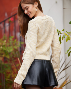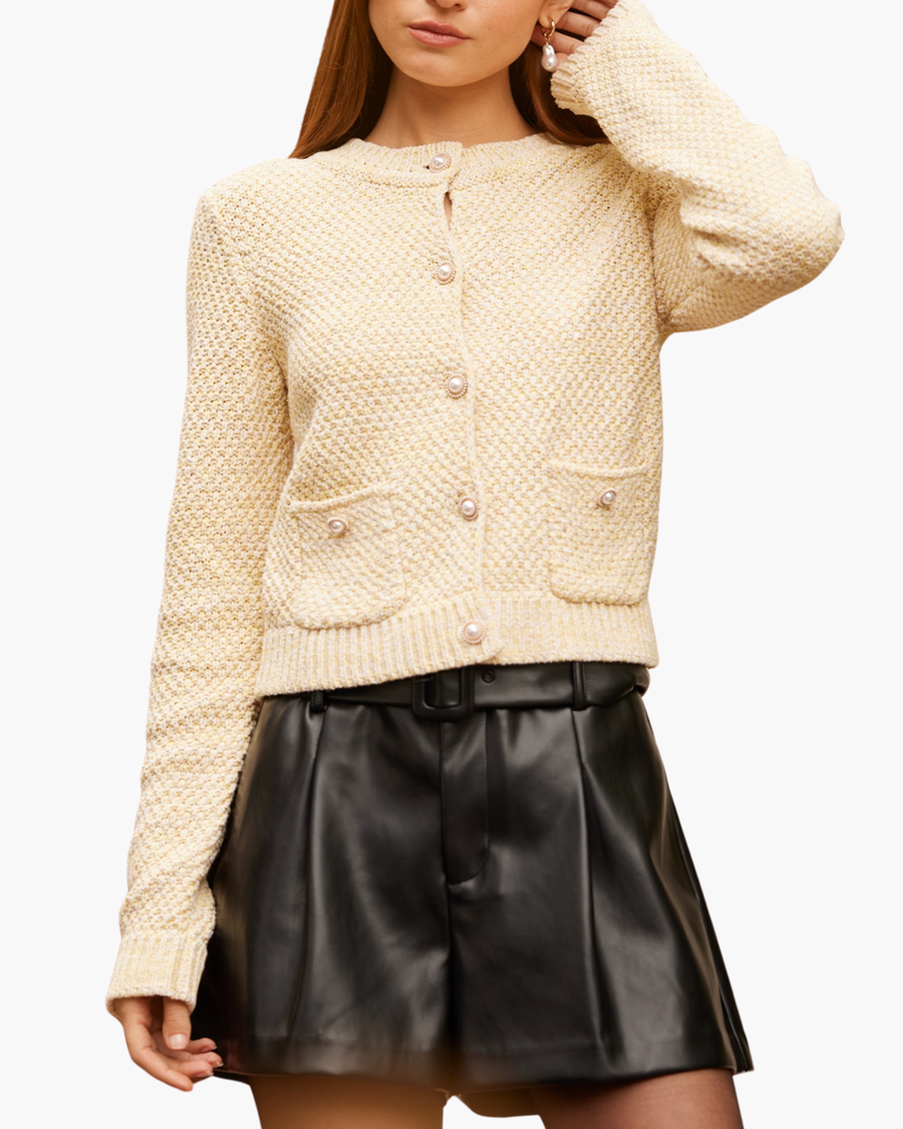 Wrap yourself in cozy charm with this Butter and Beige cardigan, featuring delicate pearl buttons that add a touch of whimsy to your outfit. The soft knit fabric keeps you comfy while the playful color combo brightens up any look