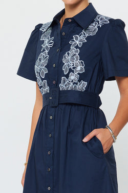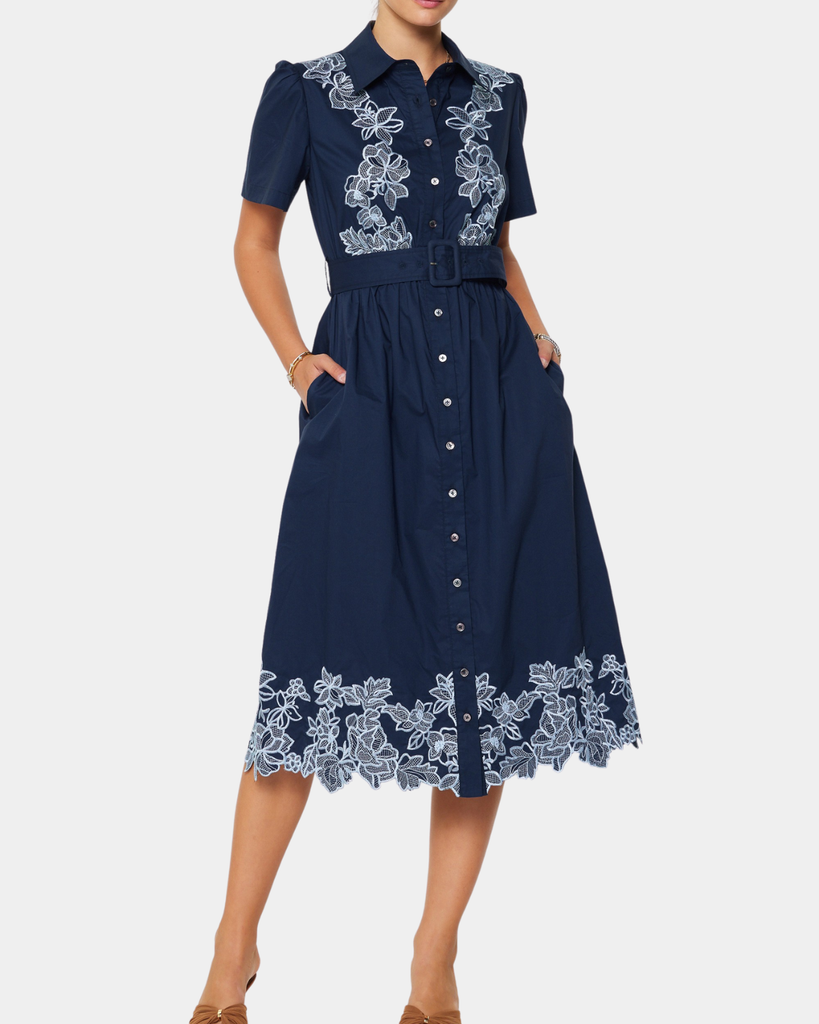Fancy up in the Embroidered Button Down Midi Dress (in navy) with some pretty (but not too serious) floral lace embroidery.