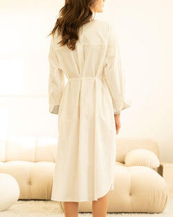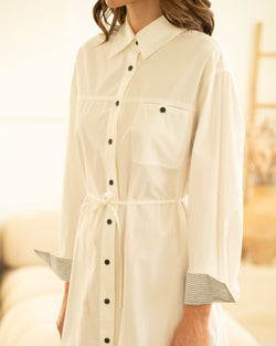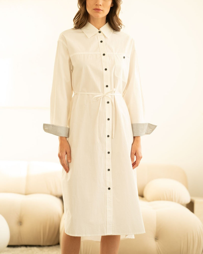 Embrace effortless style with our Button Down Midi Shirt Dress with Tie! Perfect for any occasion, this dress features a classic button down design, chic midi length, and a tie detail for added charm. Dress it up or down for a versatile and stylish look.