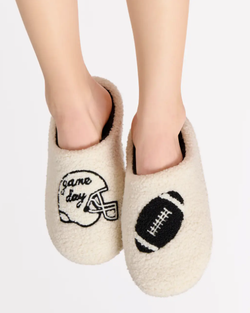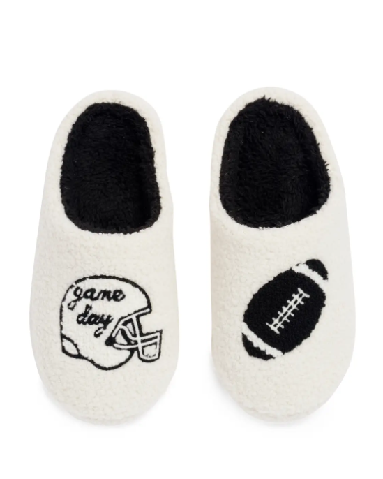Get cozy and game-day ready with our Helmet "Game Day" Slippers! These ultra-soft ivory slippers are lined with plush black sherpa and feature playful football-themed embroidery—one with a football and the other with a helmet that says “Game Day.” With a slip-on design and a snug fit, they’re the perfect pick for lounging on the couch or cheering from the sidelines at home. Whether you're catching kickoff or just running for a snack refill, your feet will stay toasty and spirited.