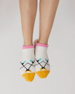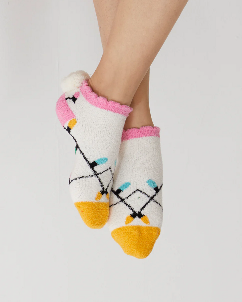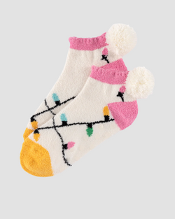 The Anya Home Socks combine cozy fuzziness with a playful twist, featuring a pompom heel and a festive Christmas light pattern in ivory, pink, yellow, and green. With a rubber grip sole and ribbon-wrapped packaging, they're the perfect gift to brighten anyone’s holiday season.