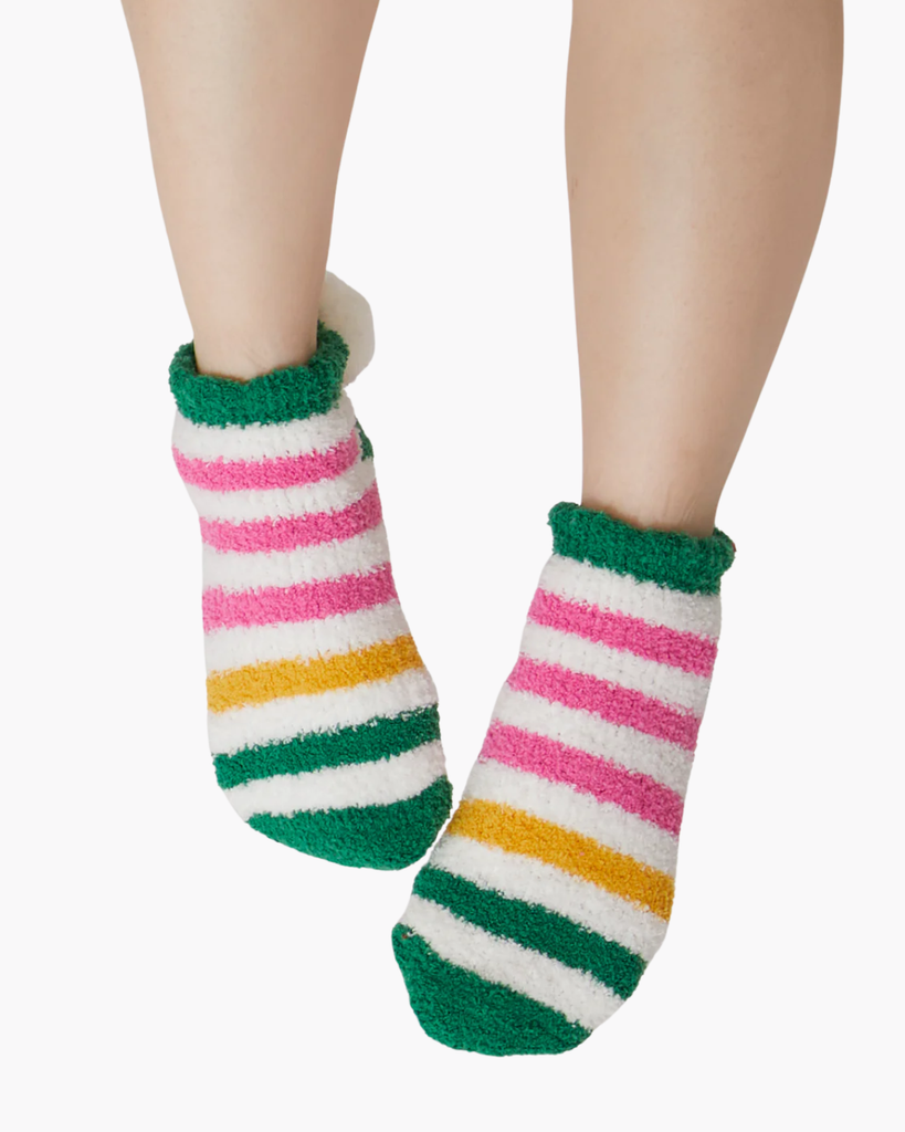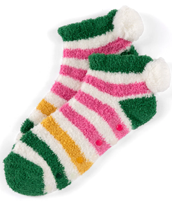Get cozy in style with the Gloria Home Socks, featuring a fuzzy feel, playful pompom heels, and vibrant multicolor stripes for a touch of fun flair. With a grippy rubber sole and charming ribbon wrap, they're the cutest gift to treat yourself or someone special!