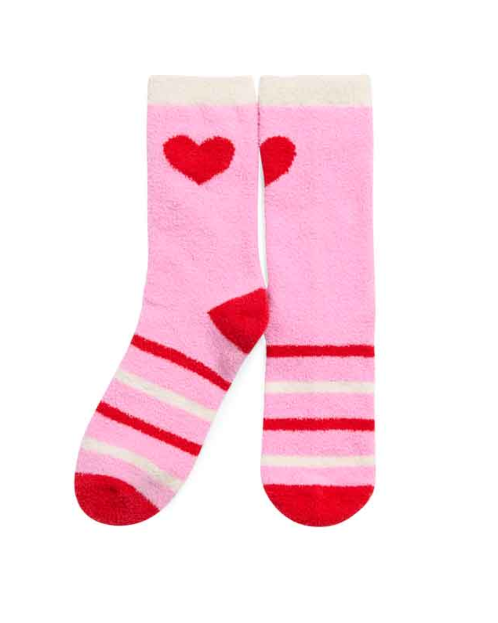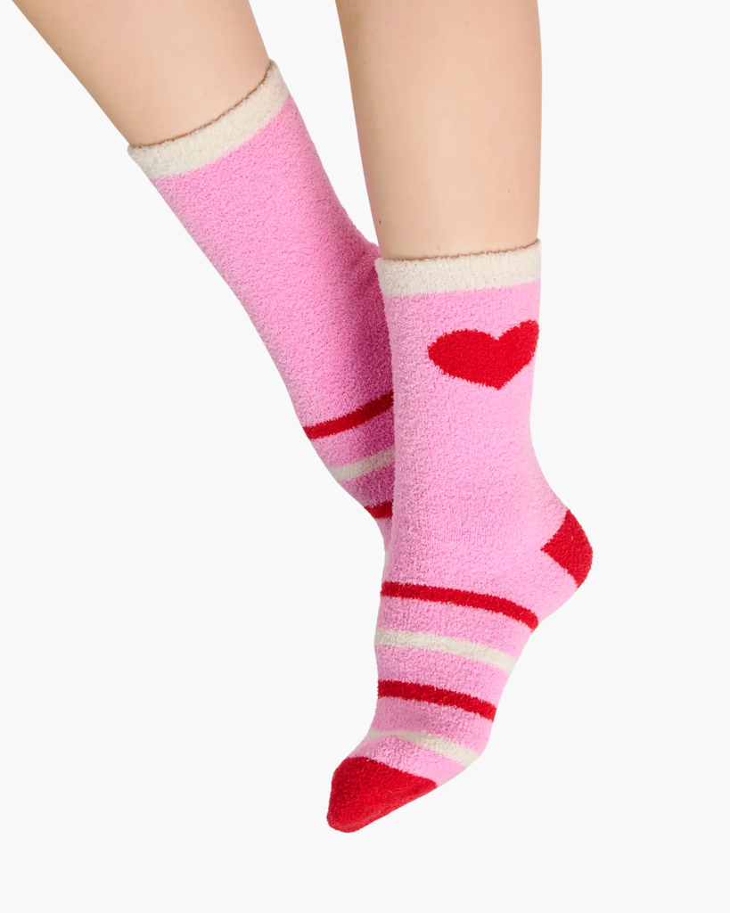 Love at your feet! These pink crew socks feature playful red hearts and candy-striped ankle bands for a cozy, cheerful look. Soft cushioned fabric with bold red heel and toe details make them perfect for lounging or gifting to someone special.