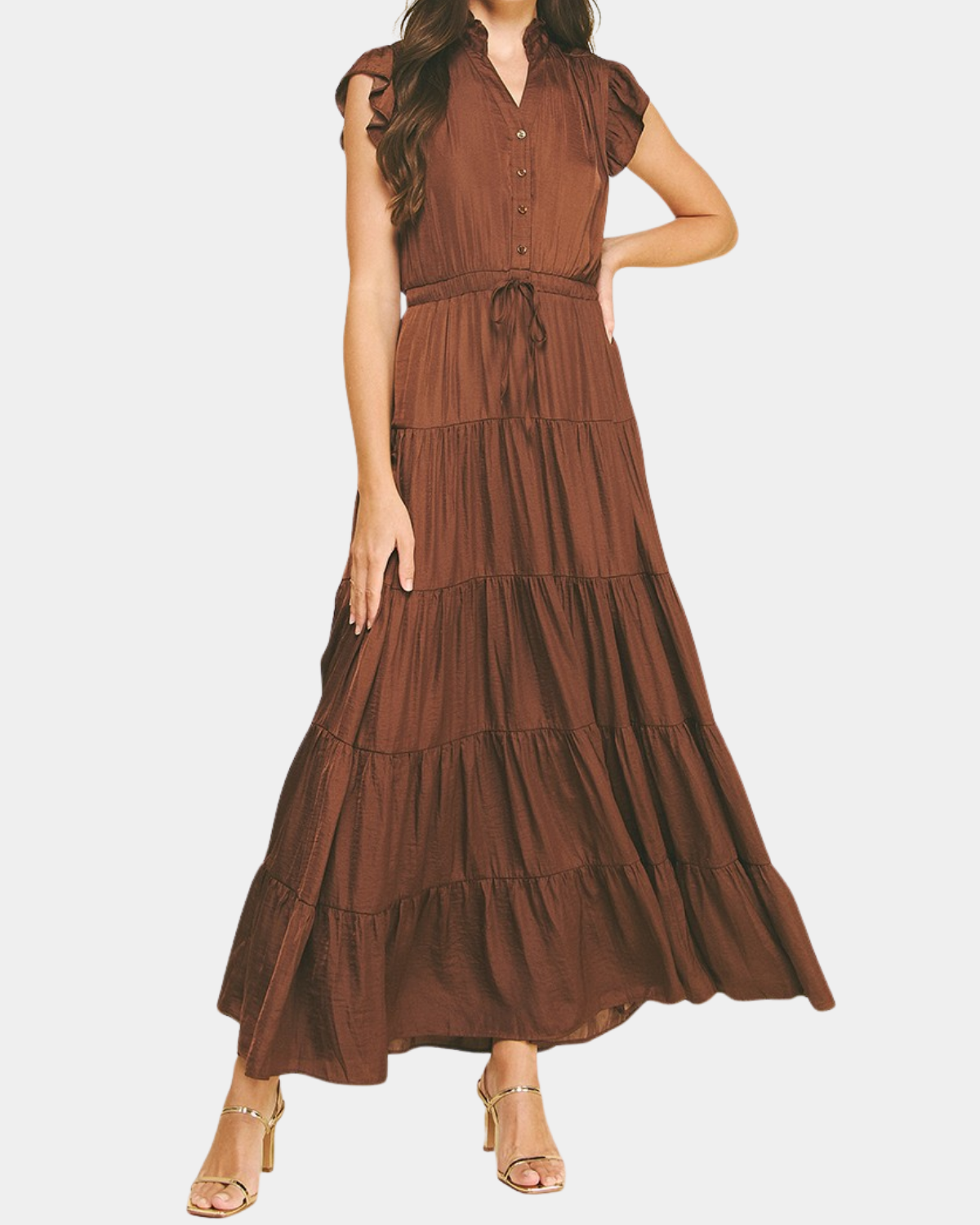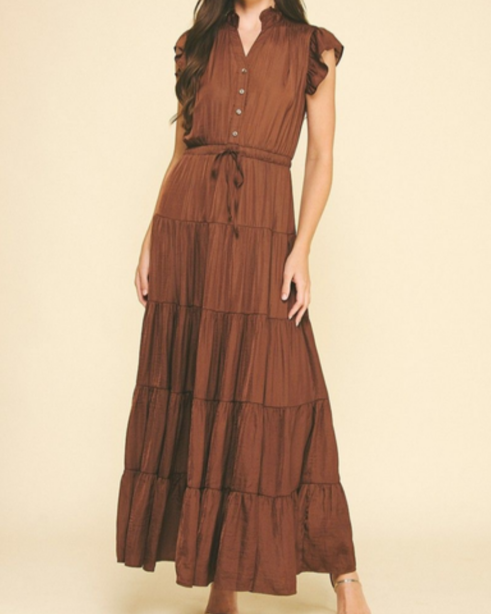 Flow through your day in this playful brown satin tiered maxi dress, where silky smooth meets fluttery layers.