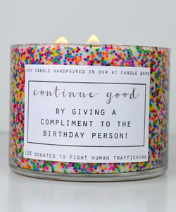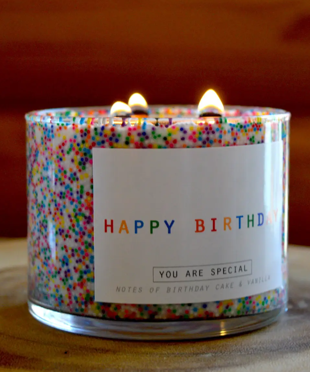 A very fitting Birthday gift with 3 wooden wicks. May this unique candle with real sprinkles inside light up your loved one's life with smiles and good smells! It smells like birthday cake with strong notes of sugar, buttercream, honey, and vanilla.