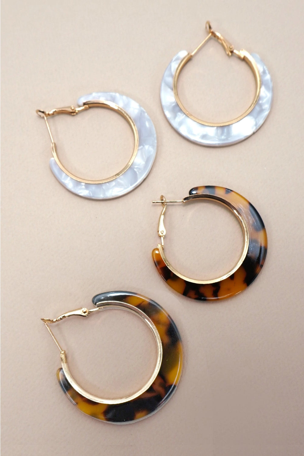 Lightweight gold-tone hoops wrapped in glossy tortoise shell acetate deliver timeless style with creamy ivory accents. The sleek, curved design transitions effortlessly from day to night, making these versatile earrings a wardrobe essential for any occasion.