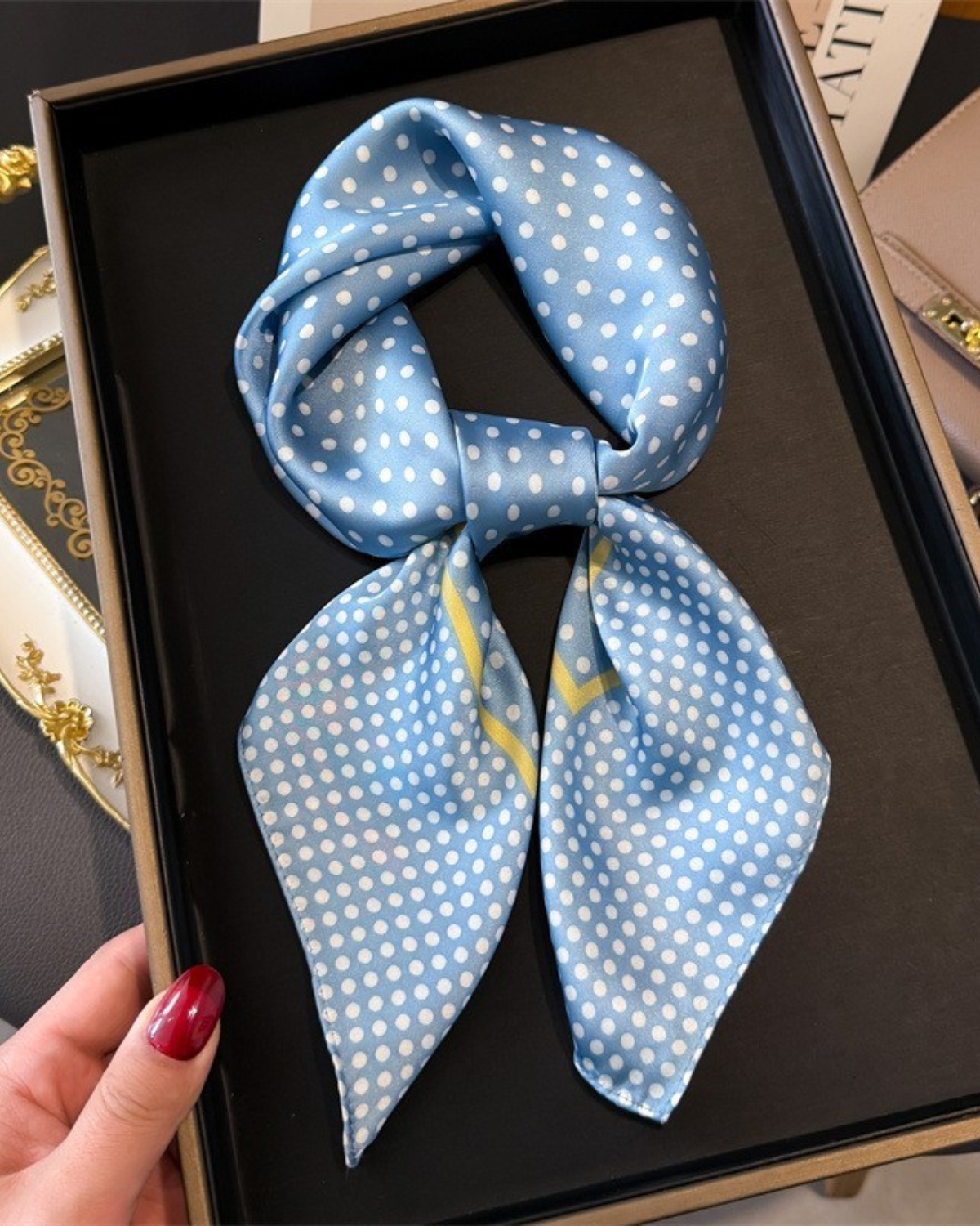 Spot the style! This versatile blue bandana scarf rocks a fun polka dot print that works as a headband, neck wrap, wrist accessory, or bag charm. One scarf, endless ways to wear it.