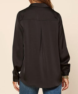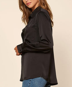 A classic buttondown shirt updated in a gorgeous satin like material. On trend, pretty and is easy to style for work or play. A wardrobe staple!