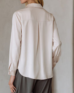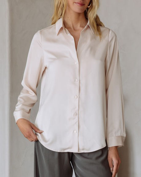 This classic button down blouse features a v-neckline, button front and long sleeves. Made from a recycled poly, this shirt gives the look and feel of a satin blouse that is easy to dress up or down and can be worn for work or play.
