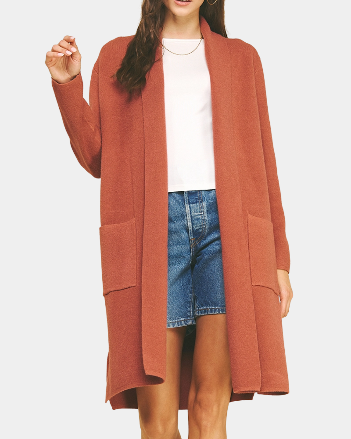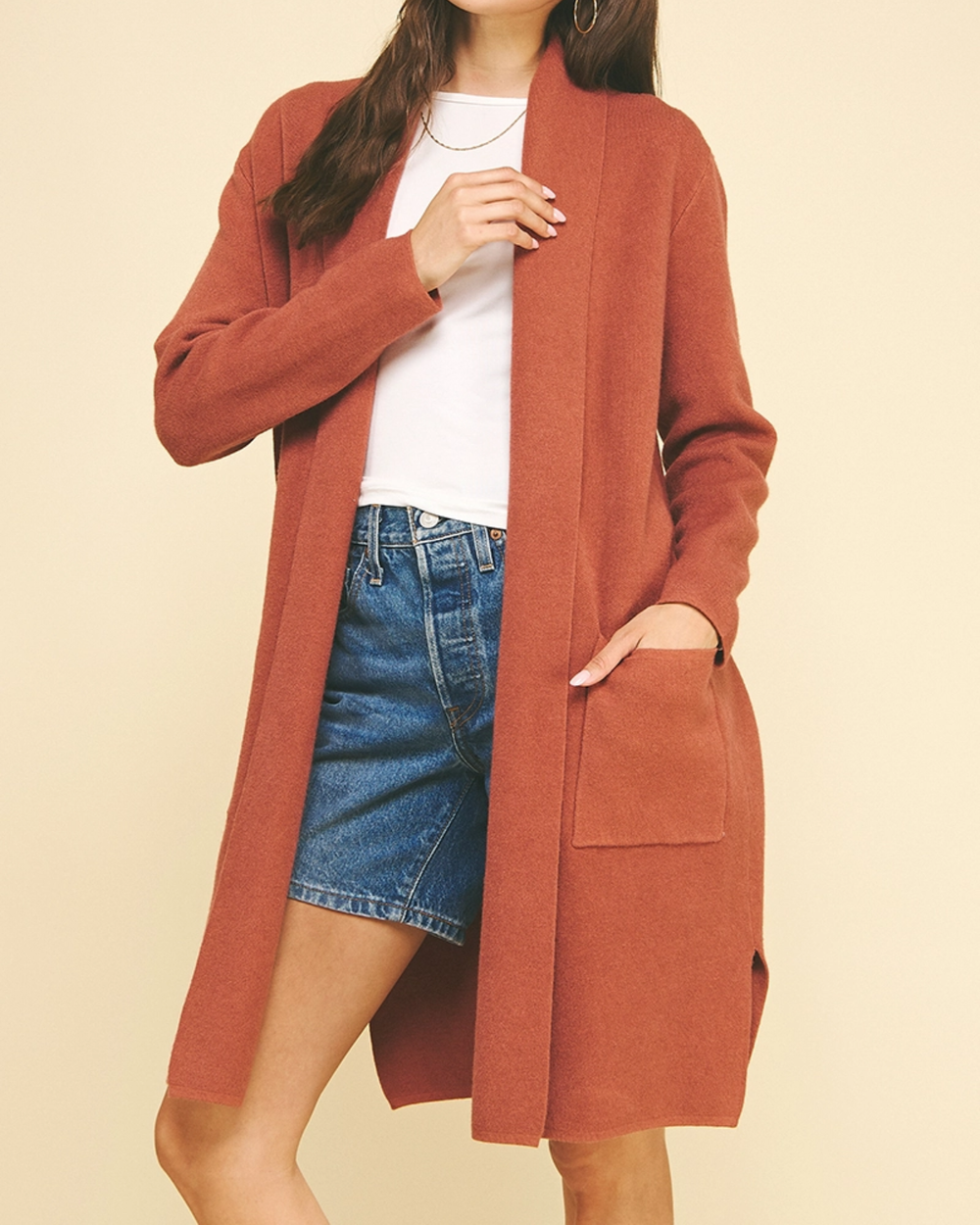 Wrap yourself in cozy charm this fall with this knit cardigan. Its open knit design makes layering effortless, adding a playful texture to your outfit while keeping you comfortably warm. Front pockets add a handy touch for stashing essentials or keeping your hands toasty. Perfect for those crisp days when you want style and comfort in one easy piece!