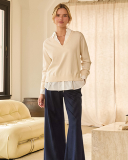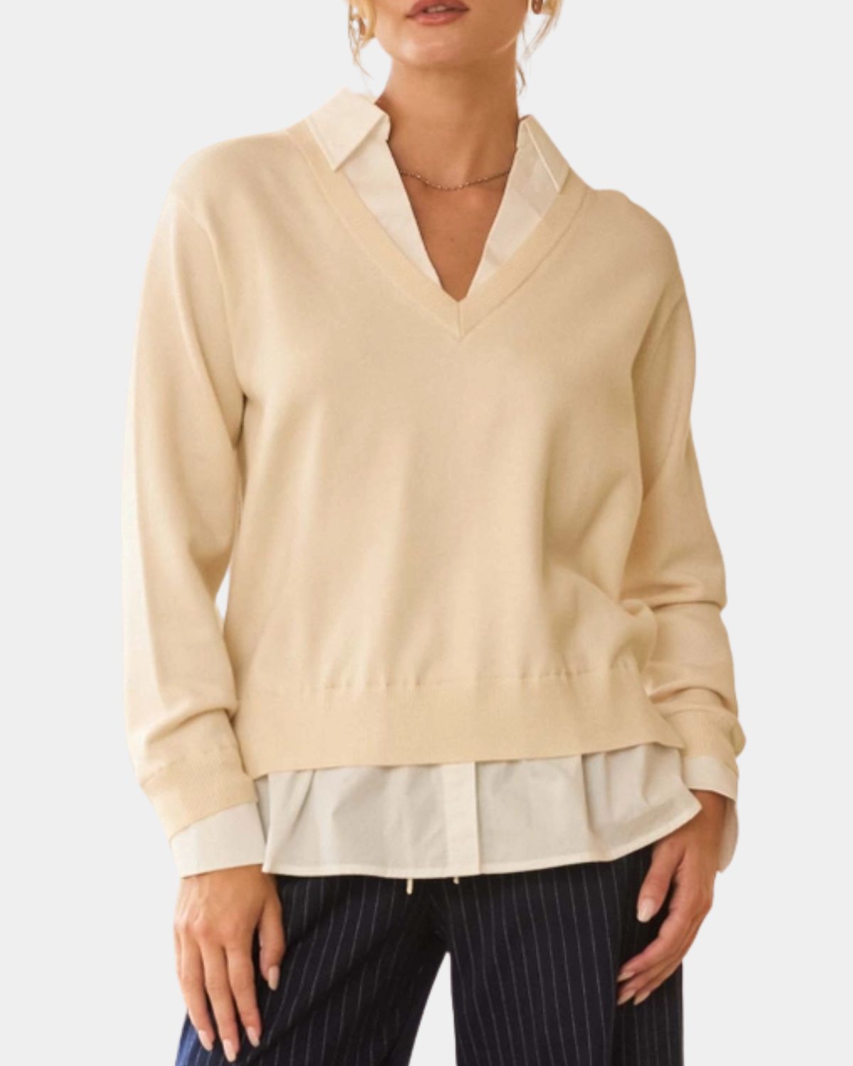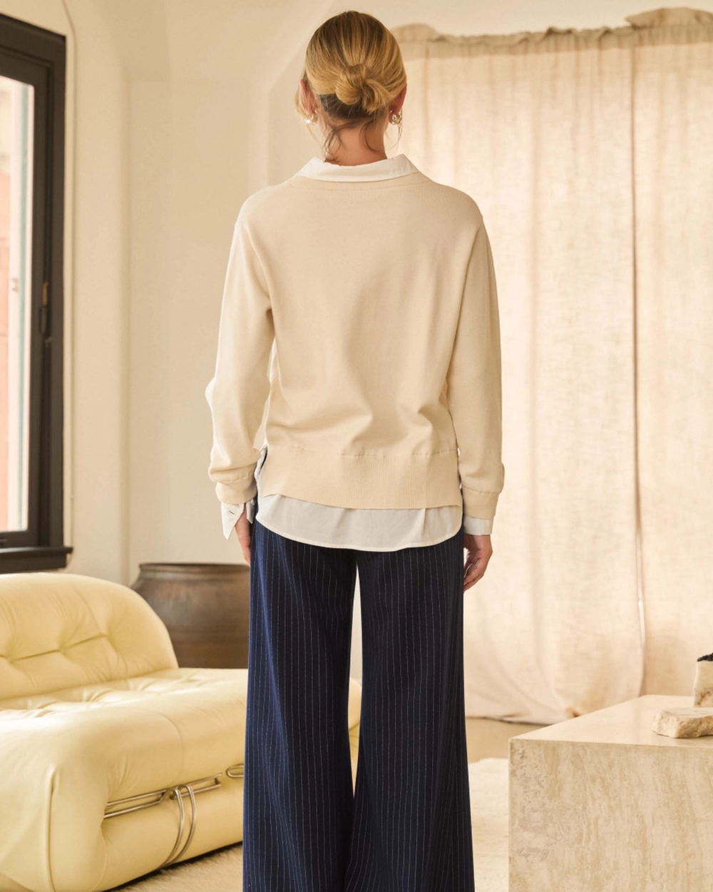 This v-neck sweater combines mixed textures for refined, contemporary style. Its layered construction pairs seamlessly with tailored trousers or denim, delivering understated elegance across every season.