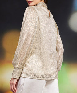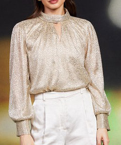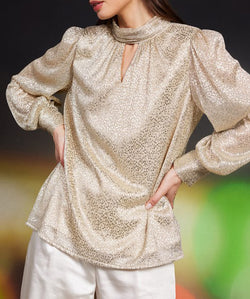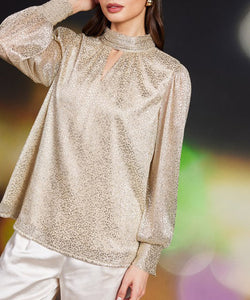 This gorgeous lurex top features long sleeves, a keyhole opening at front and shirred mock neckline. Done in a rich gold shade, this top can be dressed up or down and is a must for your next holiday party or night out.