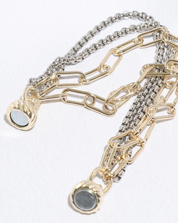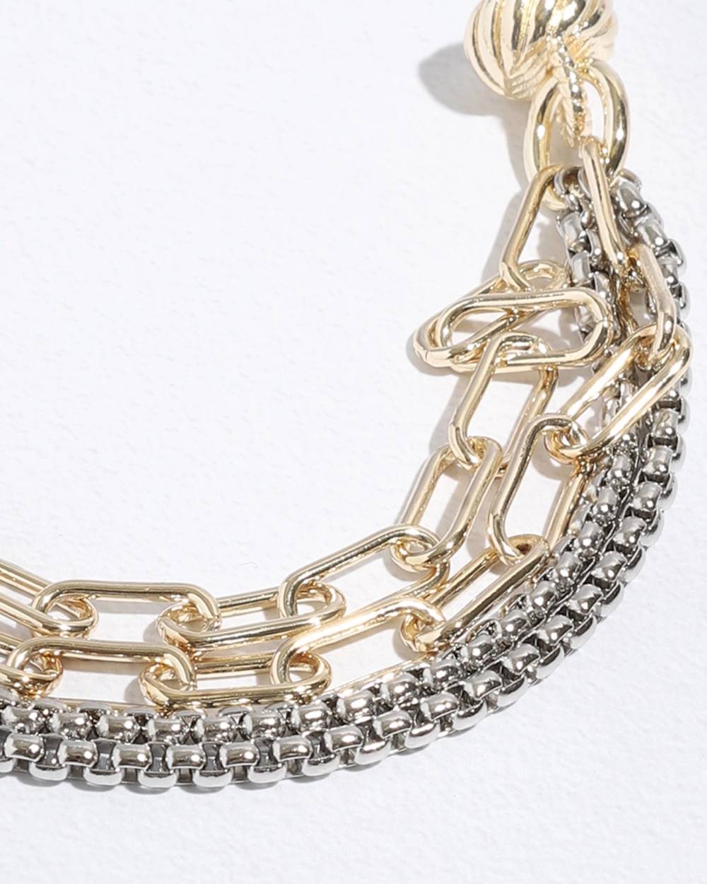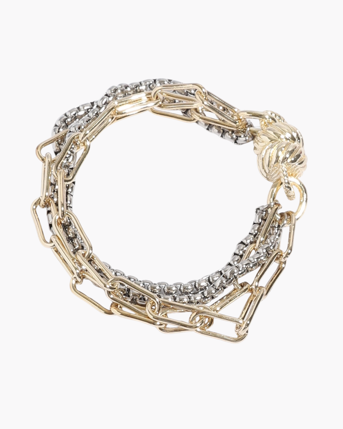 This two-tone multi-chain link bracelet pairs gold and silver strands for versatile sophistication. The magnetic closure ensures secure, effortless wear, while polished links and refined detailing deliver timeless elegance. A refined accessory that enhances any look.