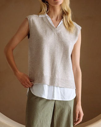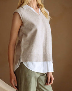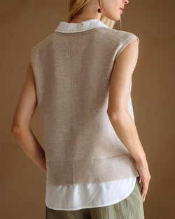 This chic shirt vest top features a mixed media design with a soft sweater vest with a white shirt detail at neck and hem. A classic look that is versatile and comfortable.