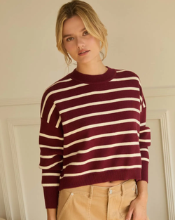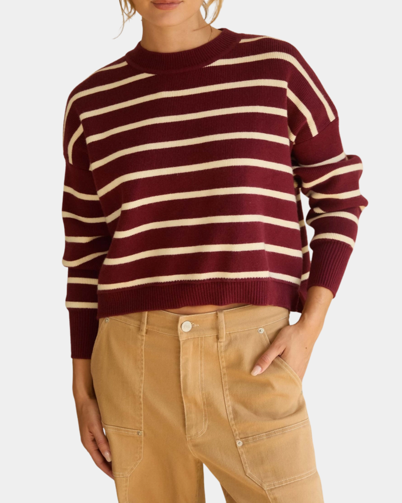 This fun and stylish sweater stands out with its bold stripes and flattering cropped shape. Made from cozy knit fabric, it’s perfect for layering or teaming up with high-waisted bottoms to create a fresh, easygoing outfit.