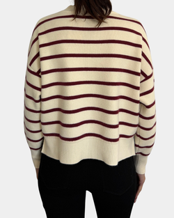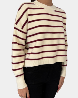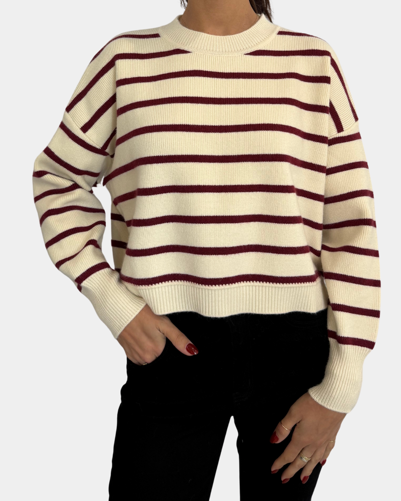 This fun and stylish sweater stands out with its bold stripes and flattering cropped shape. Made from cozy knit fabric, it’s perfect for layering or teaming up with high-waisted bottoms to create a fresh, easygoing outfit.