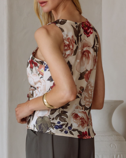 This gorgeous satin floral top features a gathered center with a tie front. A sleeveless silhouette that is perfect to wear solo or for layering under a cardigan or blazer.