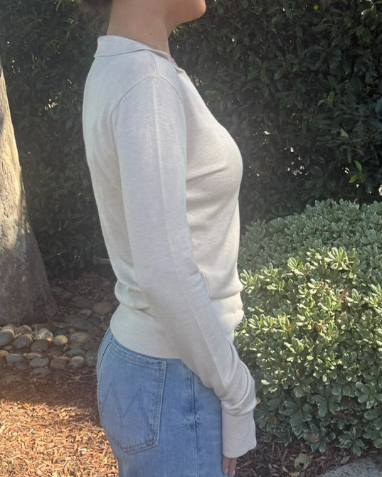 This soft knit top features a collared v-neckline, long sleeves and gold button detail at the sleeve. A wardrobe staple for work or play.