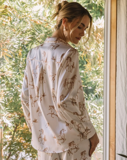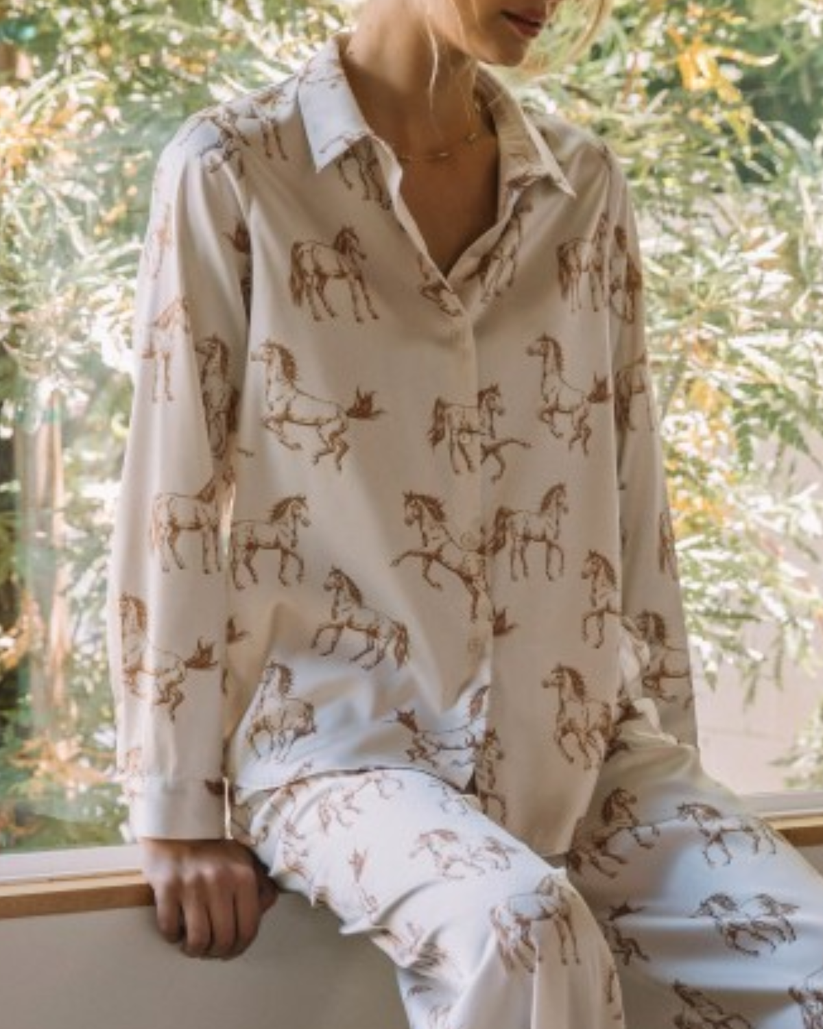 This charming Horse Print Button-Down Shirt blends equestrian flair with timeless style. Style it your way—with jeans for relaxed vibes or tailored pants for polished elegance.