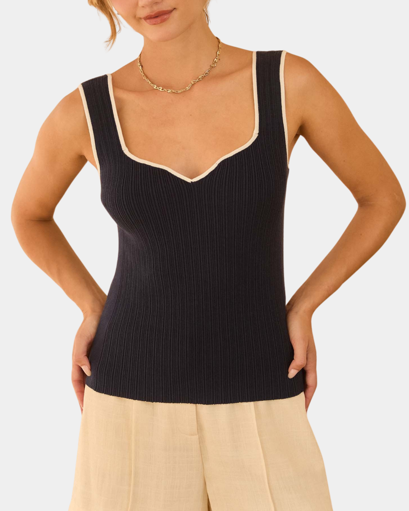 A refined essential with heart-shaped neckline detailing and structured knit construction. The contrast trim adds understated elegance to this versatile navy and white tank.