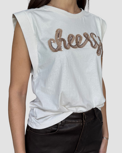 "Cheers!" embroidered in a soft, fuzzy, and slightly metallic beige thread across the chest