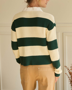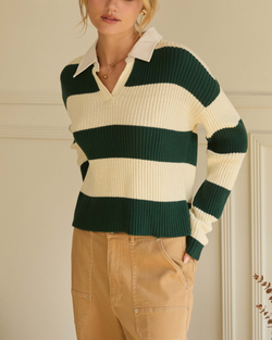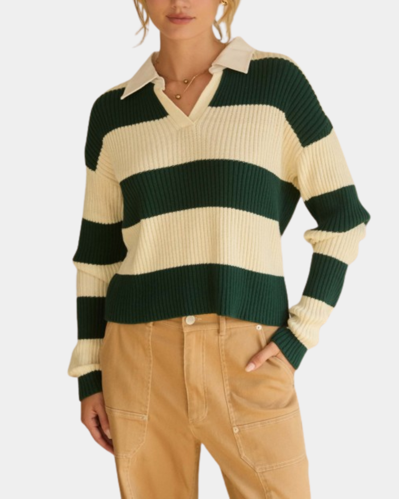 This playful twist on the classic polo is made from cozy ribbed knit fabric with fun, timeless stripes. With its sharp collar and comfy fit, it’s the perfect pick for easygoing days or dressier vibes.