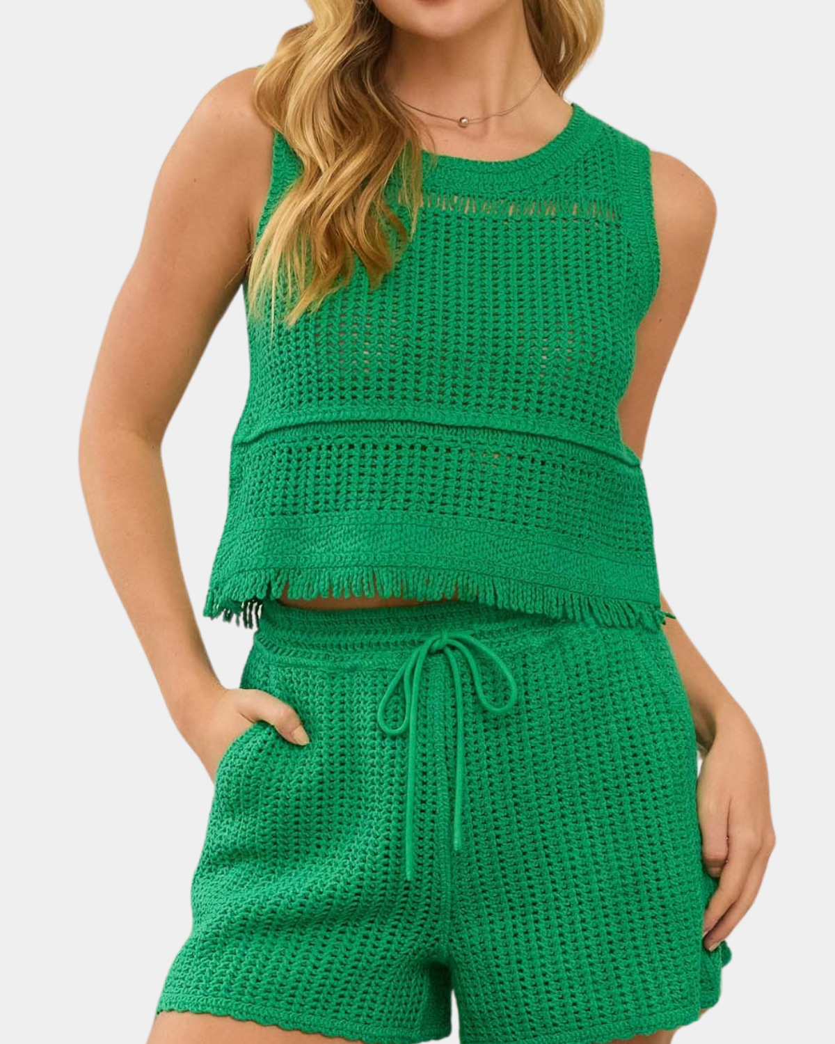 This sleeveless crochet top features an open-knit texture and playful fringed hem that moves with you. Lightweight and breathable, it's your go-to for effortless boho vibes all summer long. Layer it over a tank or swimsuit, or wear it solo for festival season and beach getaways.