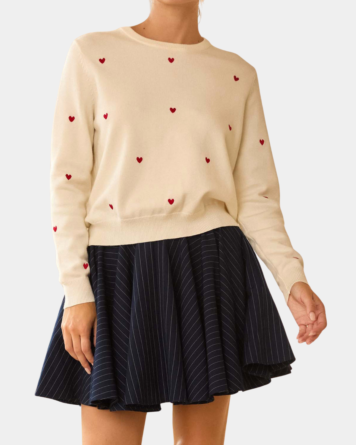 This adorable sweater top blends cozy comfort with whimsical heart embroidery for an effortlessly cute look. Soft knit fabric pairs perfectly with jeans or skirts, making it your go-to piece for stylish everyday wear with personality.