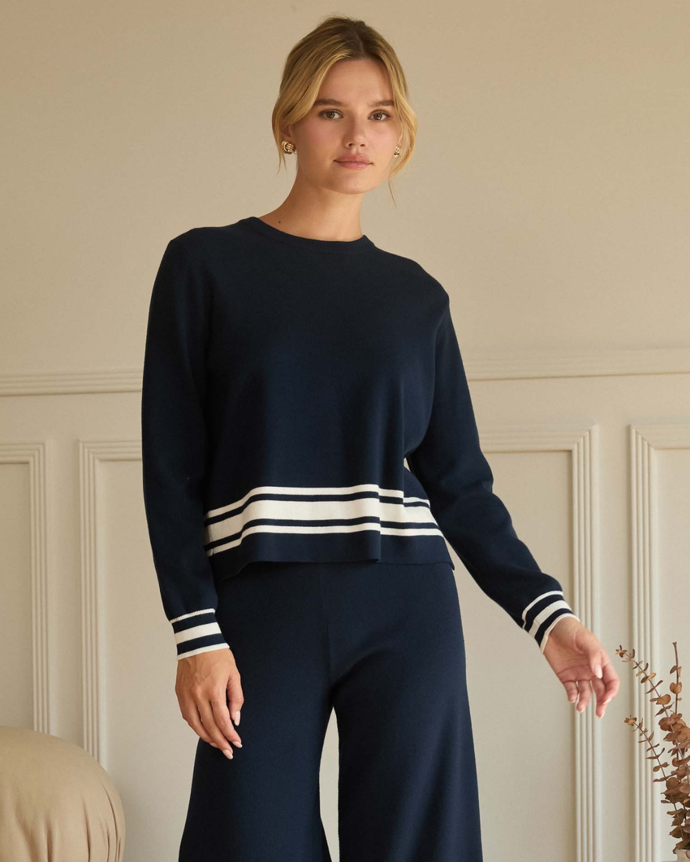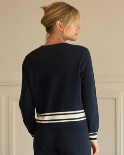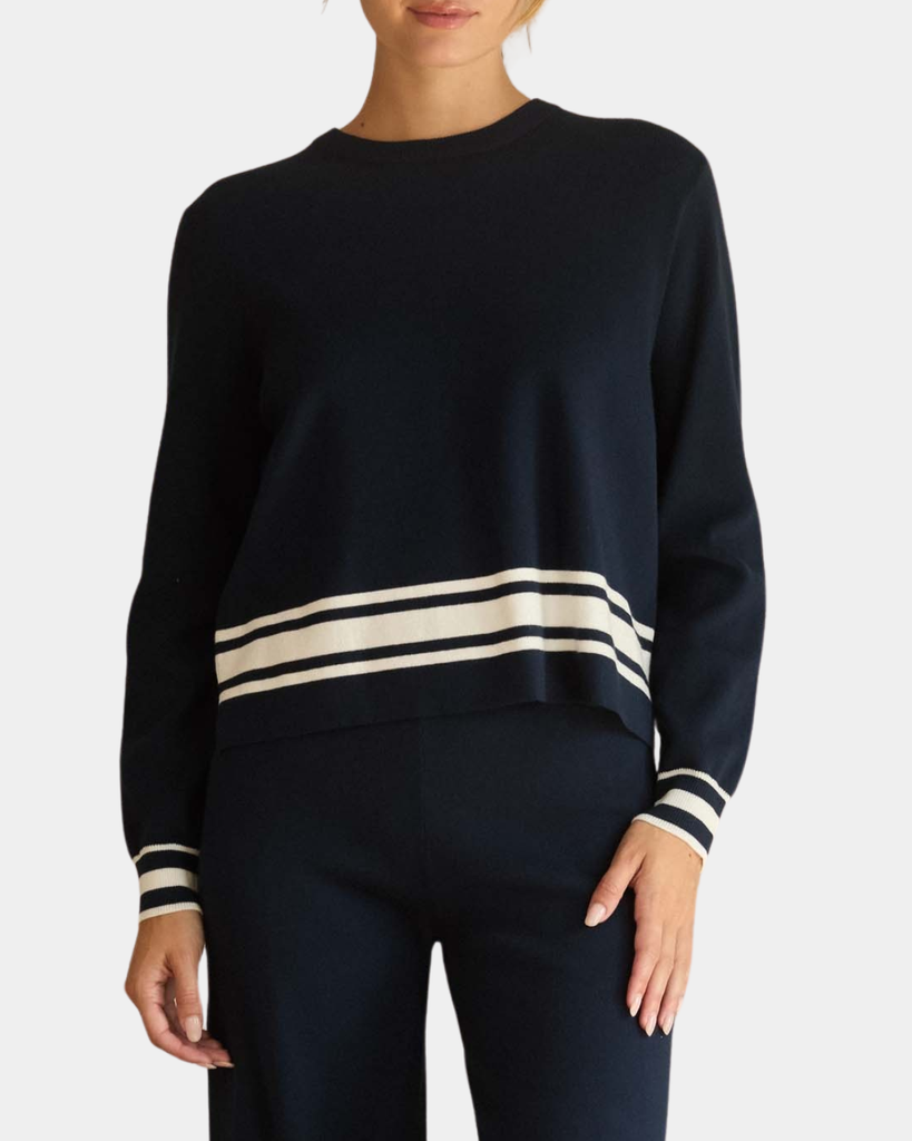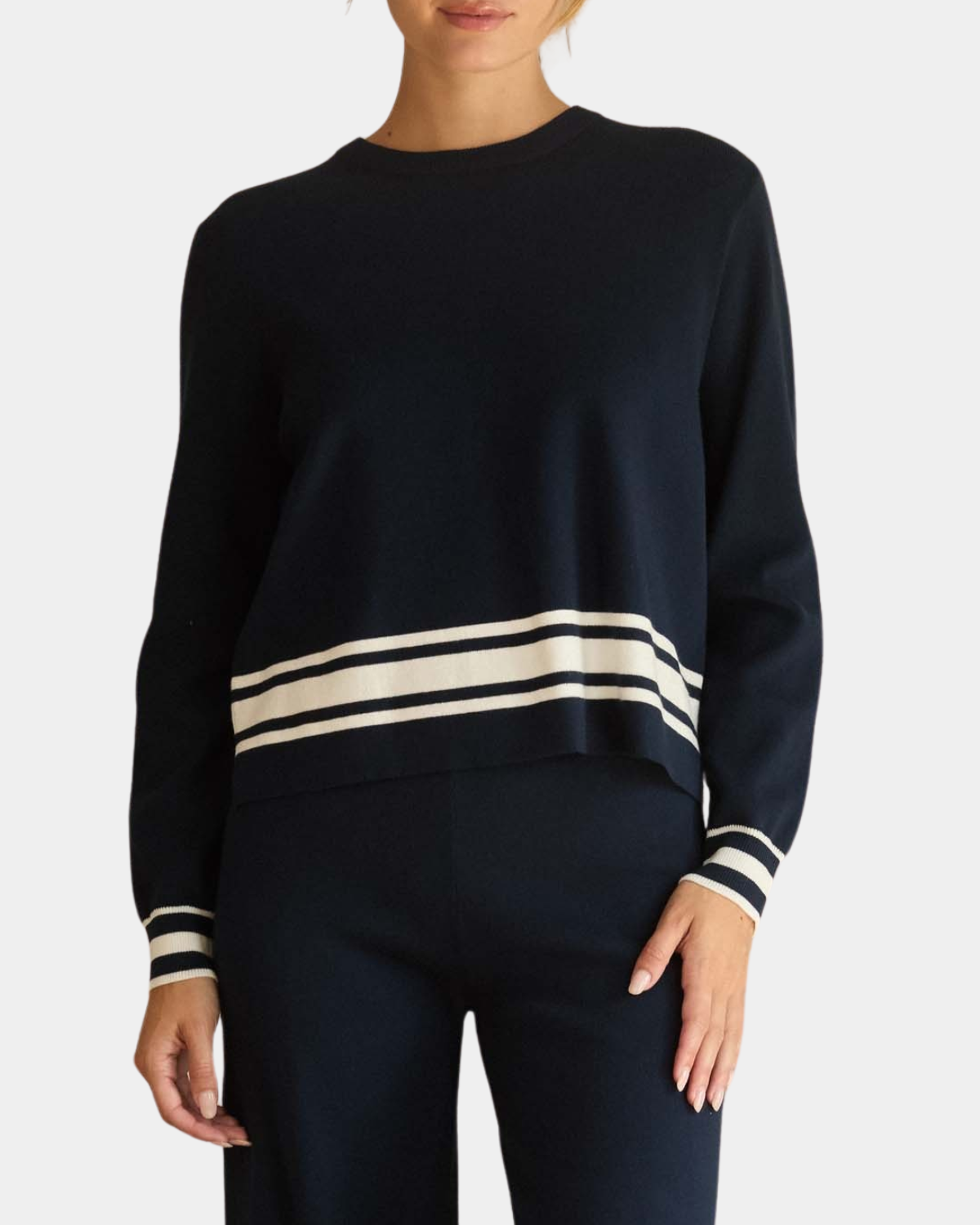 A refined long-sleeve sweater with a crisp crew neckline and eye-catching striped hem. Pair with the matching knit pants for a polished set.