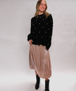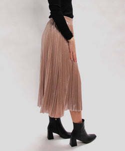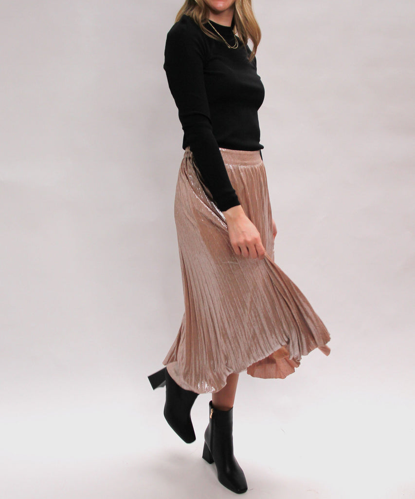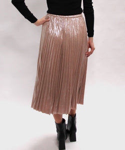 This Foil Coated Pleated Midi Skirt blends timeless elegance with a touch of shimmer, thanks to its foil-coated finish. The pleated design adds graceful movement and style, perfect for both daytime and evening occasions. Make a statement and shine with confidence in this versatile and eye-catching piece!
