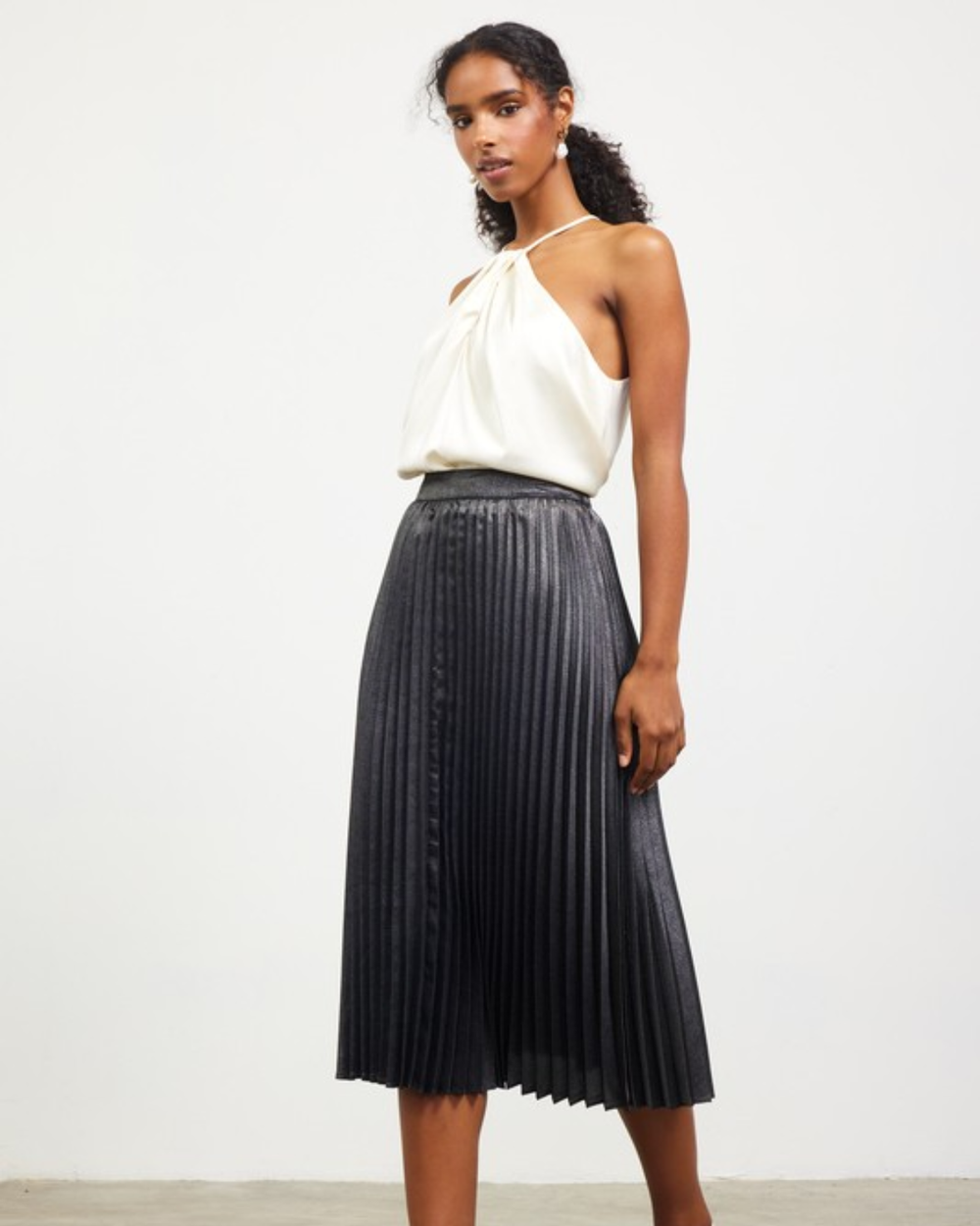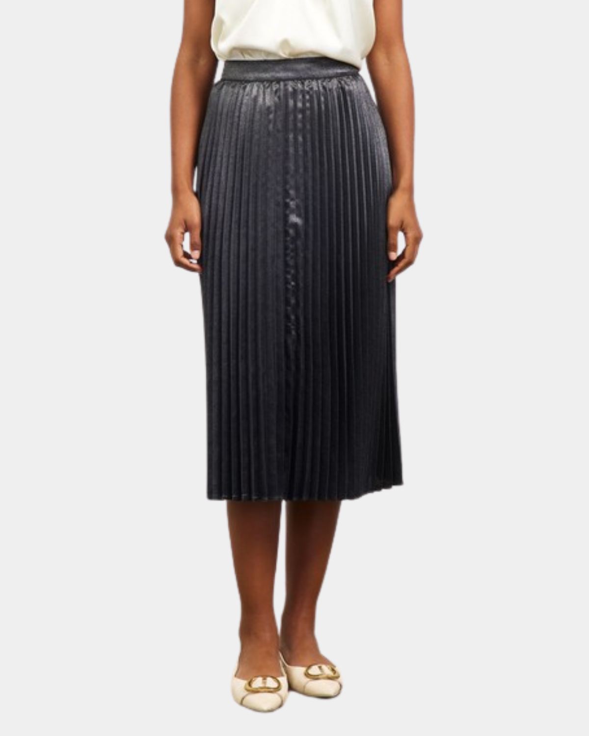 This Metallic Pleats Midi Skirt combines lustrous shimmer with refined elegance. The expertly pleated design and midi length create a graceful silhouette perfect for evening occasions or elevated everyday wear. A sophisticated choice for those seeking understated glamour.