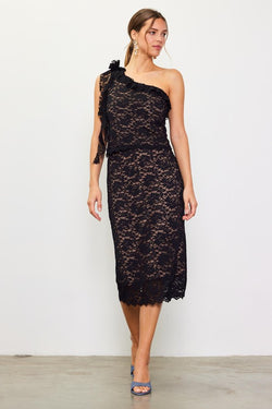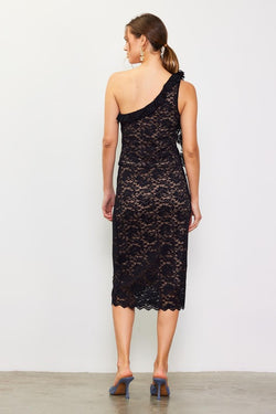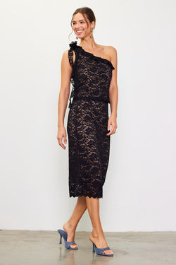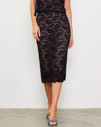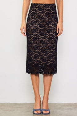This black lace midi skirt embodies timeless elegance, combining delicate lace detailing with a flattering midi length. Its refined design makes it a versatile addition to any wardrobe, perfect for sophisticated occasions or elevating everyday style with a touch of grace.