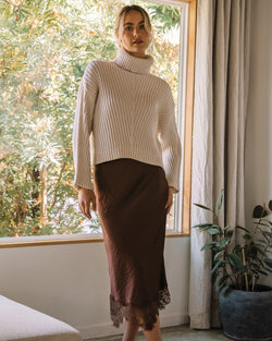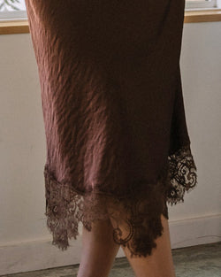 Elevate your wardrobe with this sophisticated satin midi skirt in a rich dark brown shade. Featuring delicate lace trim, it adds a subtle touch of elegance and femininity. The smooth satin fabric offers a graceful drape, making it perfect for both formal occasions and chic everyday wear.