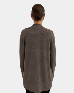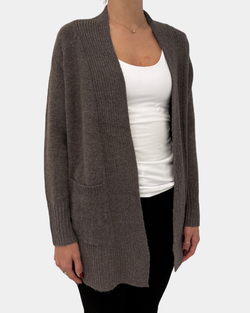 Cozy up with this ribbed front cardigan in a rich dark brown, perfectly paired with handy pockets to stash your little treasures.