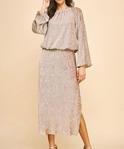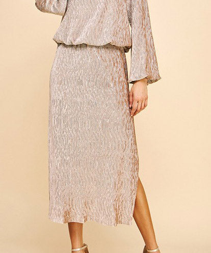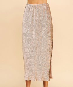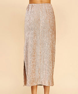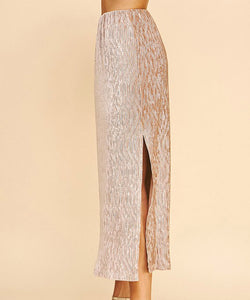 This gorgeous midi skirt features a textured knit fabrication, elastic at the waist and a side slit. This look brings the glam and can be styled with the matching top or keep it simple with a black bodysuit for a night out.