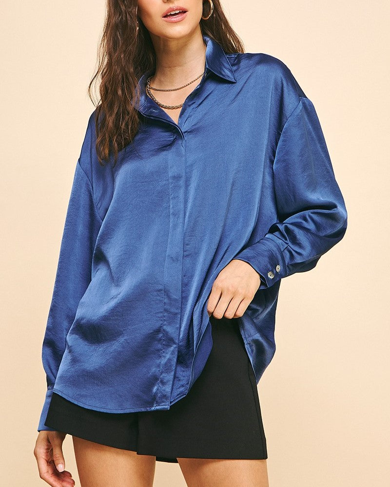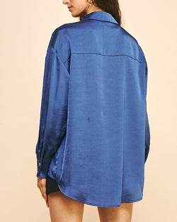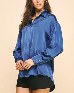 Slip into silky style with our Solid Satin Blouse in Midnight Blue. This lightweight blouse boasts a luxurious sheen and versatile design that can easily transition from day to night. Elevate your wardrobe with this timeless, yet playful, addition.