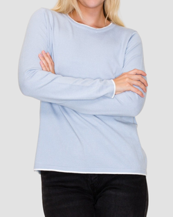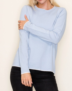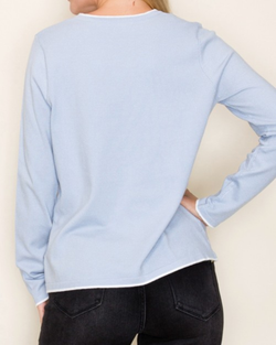 Add a pop of playful charm to your wardrobe with this powder blue sweater featuring vibrant color accents.