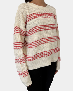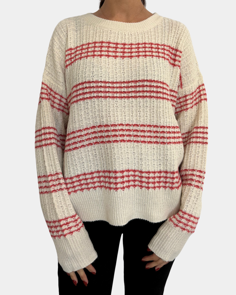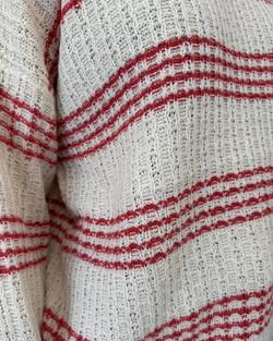 Cozy up in this lively red textured stripe sweater that adds a fun pop to any outfit. Its playful design keeps you warm and stylish, perfect for brightening up chilly days!