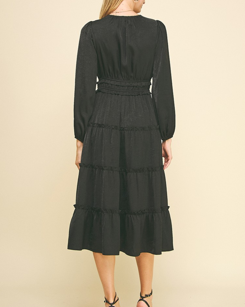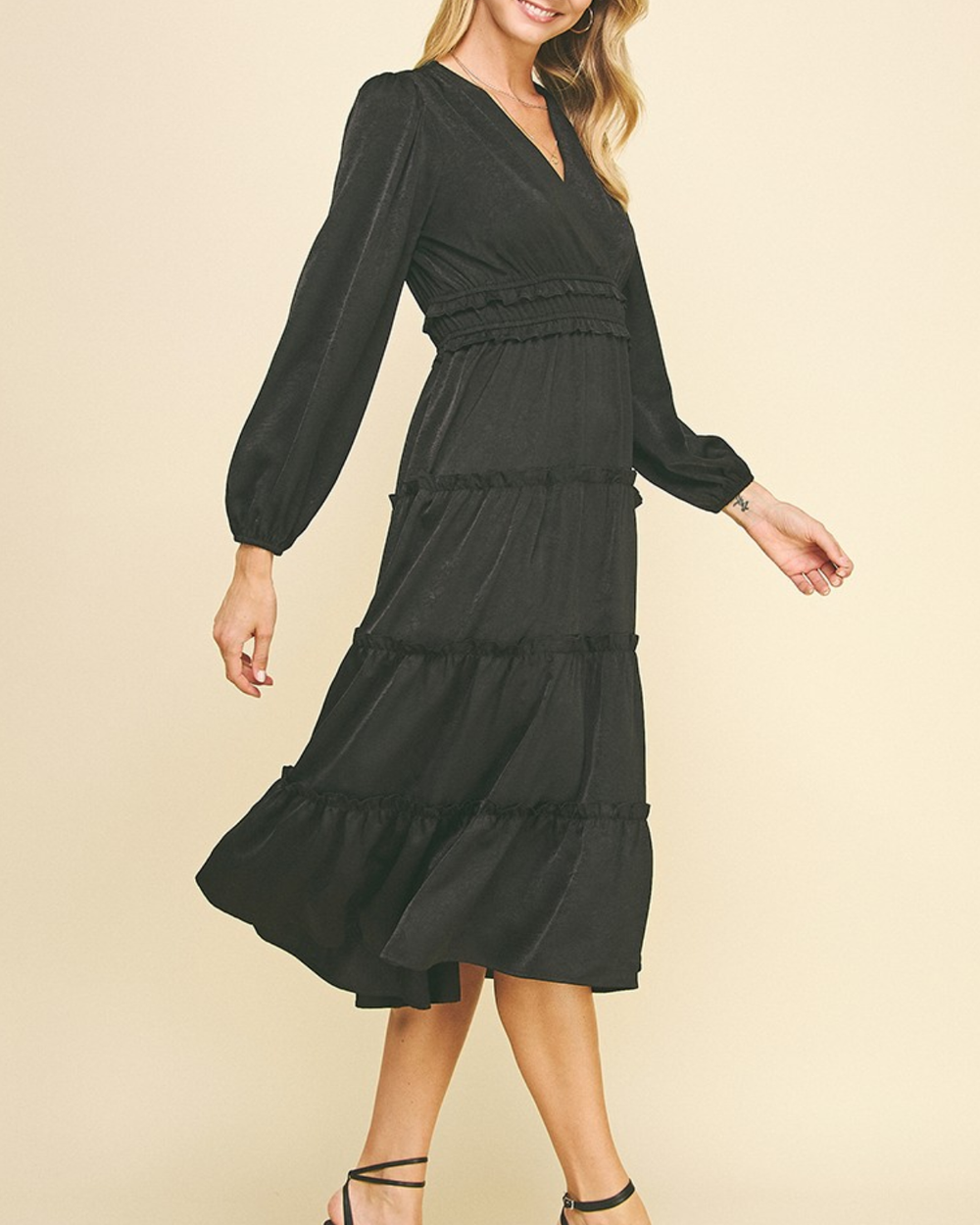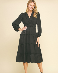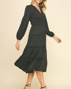 This best selling silhouette is back for the season. This gorgeous dress features a v-neckline, ruffled detail and long sleeves.