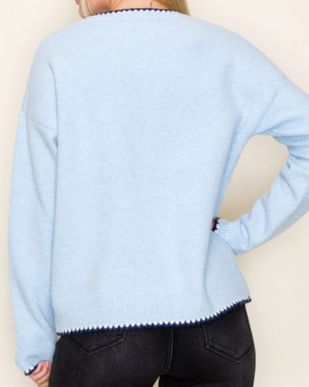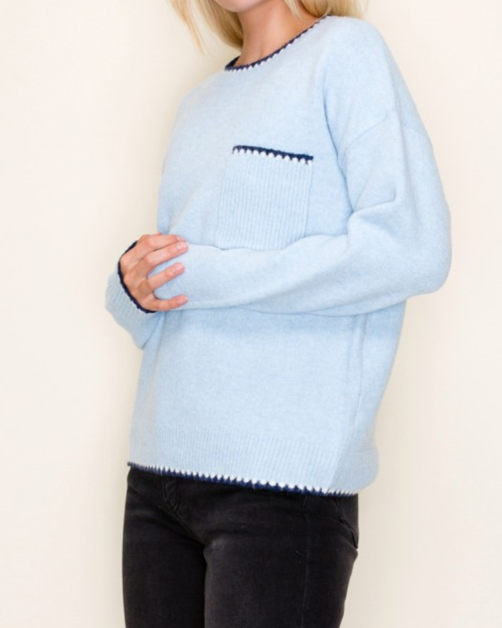 Cozy up in this light blue pullover sweater featuring a fun color-stitched edge and a handy chest pocket for all your essentials