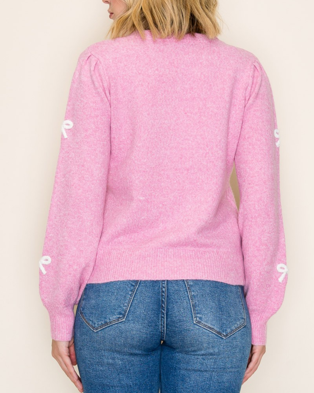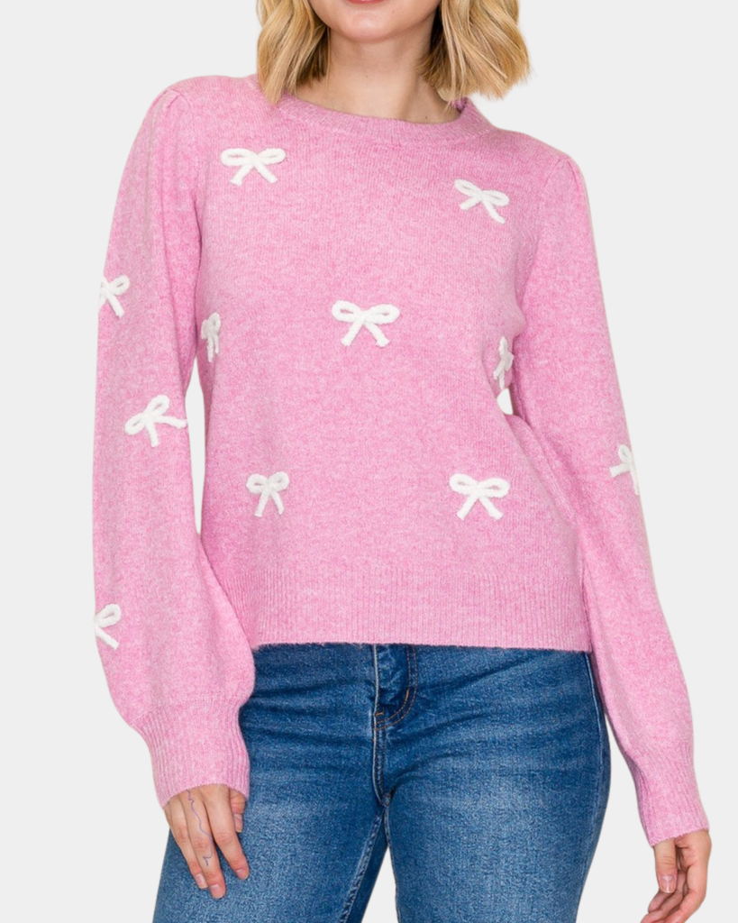 Cozy up in this adorable pink sweater featuring a charming bow embroidery on the chest. The soft fabric and long sleeves make it perfect for staying warm and comfy all season long.