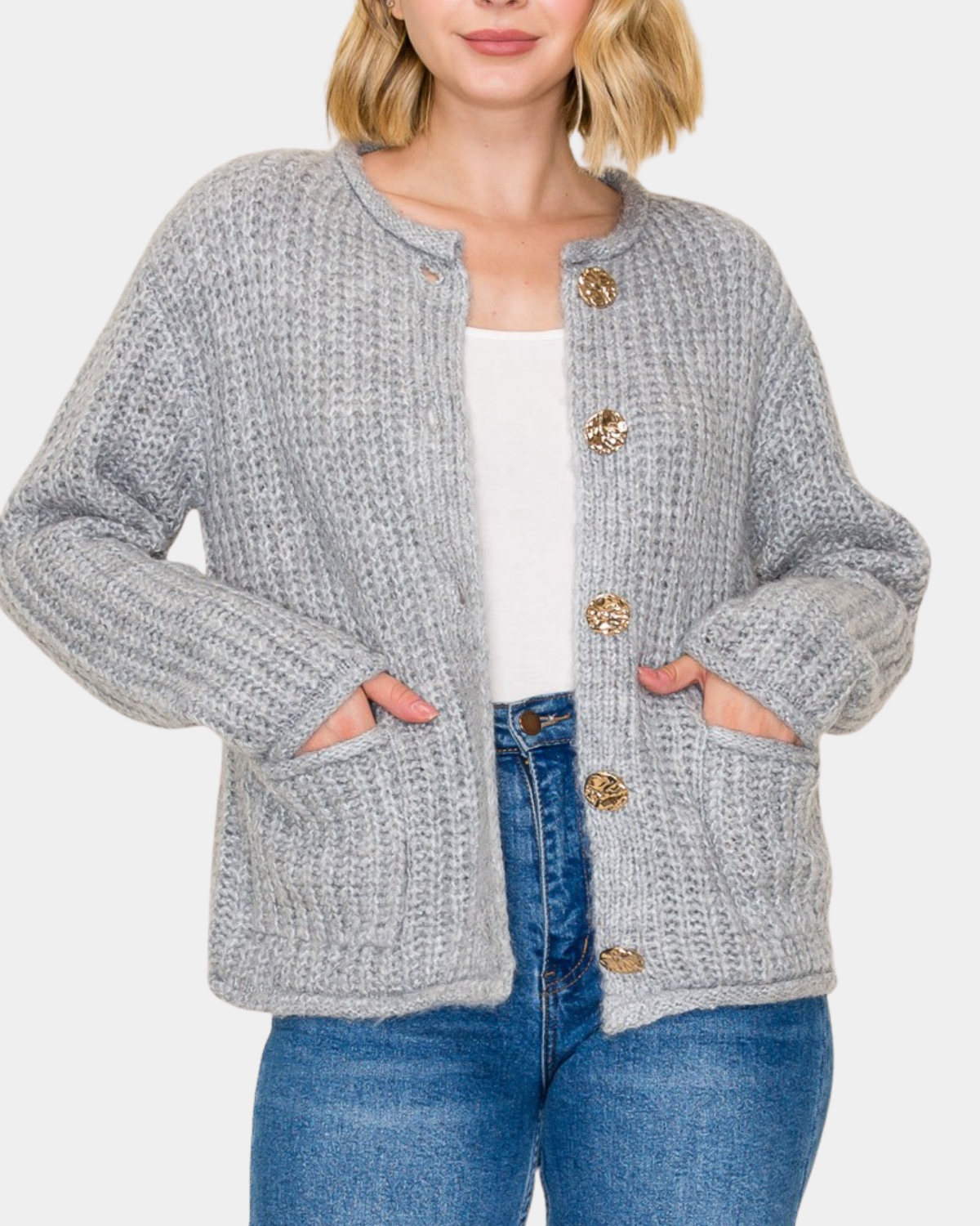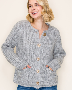 Wrap yourself in cozy vibes with this chunky yarn cardigan. The oversized fit and metal button details give major comfort-meets-style energy.