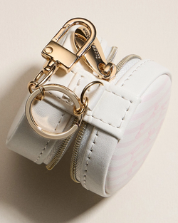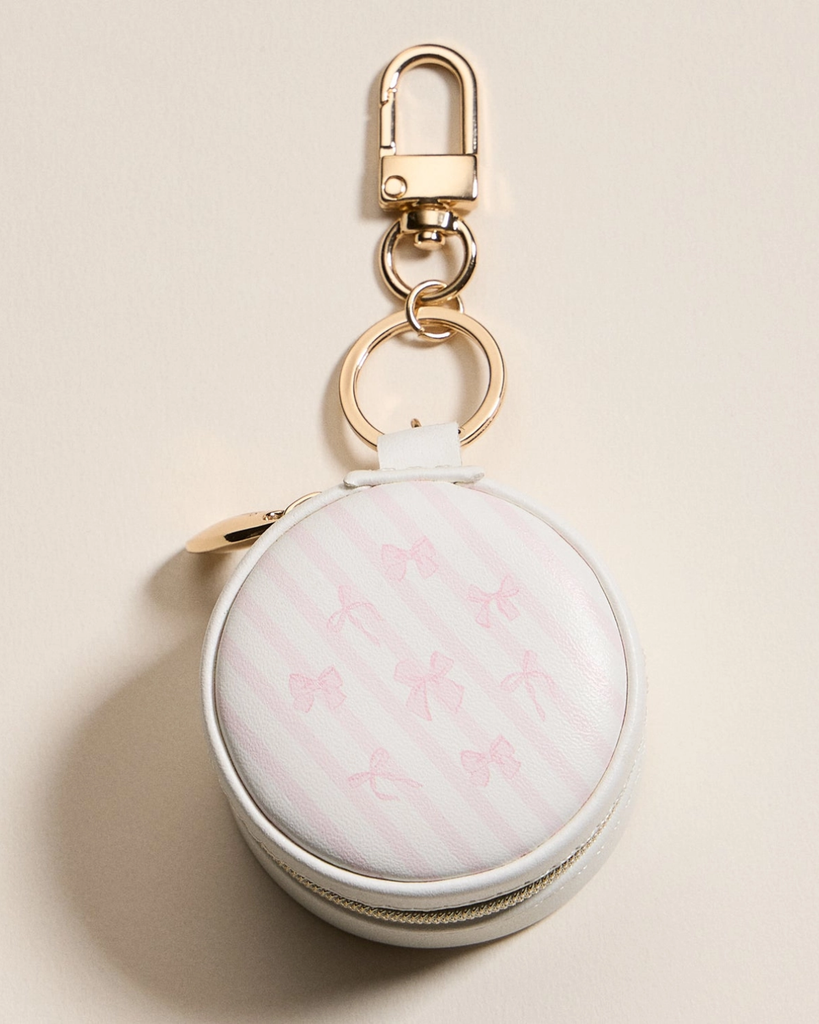 Round Jewelry Travel Case Keychain - White/Pink Bow Design