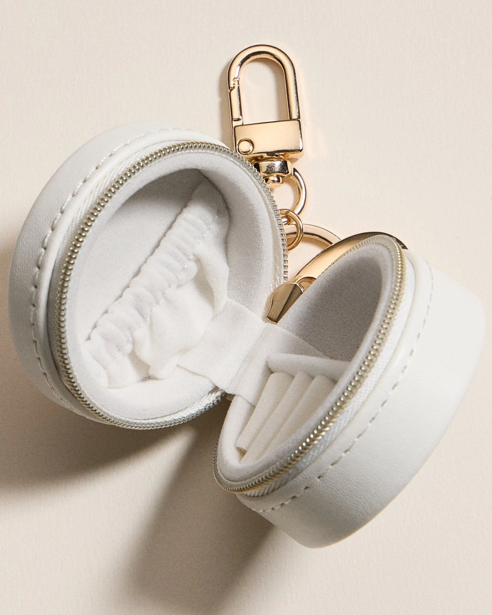 Toss this adorable mini printed jewelry case into your bag and never lose a precious piece again. With velvet-lined compartments for rings, earrings, and necklaces, plus a trusty zipper and gold keychain clip, it's your stylish travel buddy. Perfect for on-the-go glam or gifting.