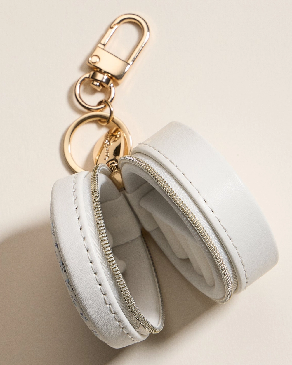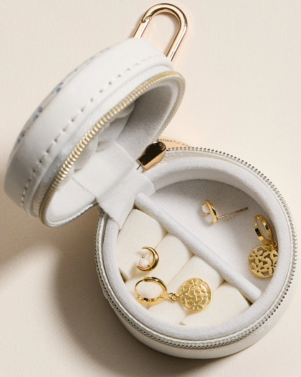Toss this adorable mini printed jewelry case into your bag and never lose a precious piece again. With velvet-lined compartments for rings, earrings, and necklaces, plus a trusty zipper and gold keychain clip, it's your stylish travel buddy. Perfect for on-the-go glam or gifting.