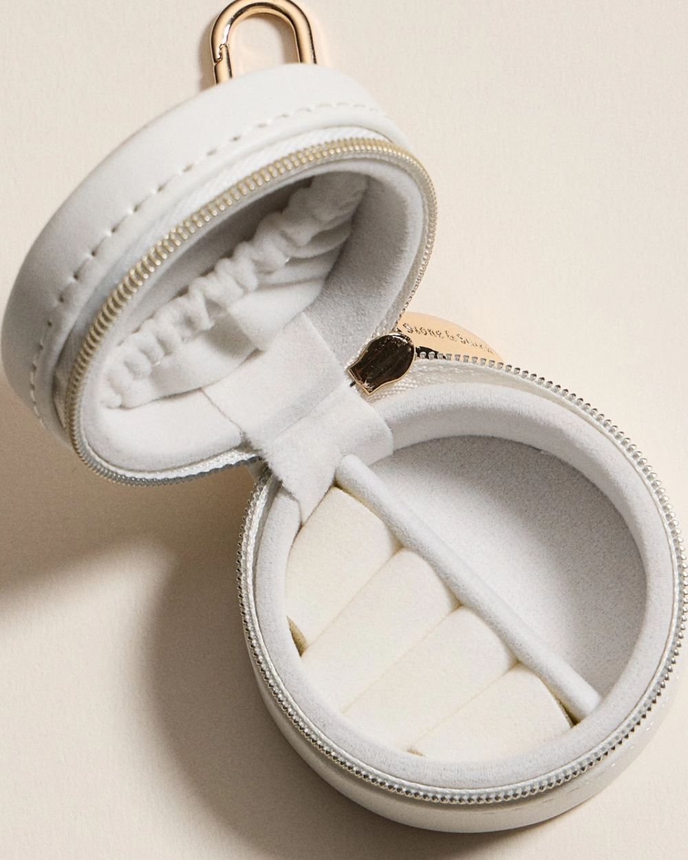 Toss this adorable mini printed jewelry case into your bag and never lose a precious piece again. With velvet-lined compartments for rings, earrings, and necklaces, plus a trusty zipper and gold keychain clip, it's your stylish travel buddy. Perfect for on-the-go glam or gifting.