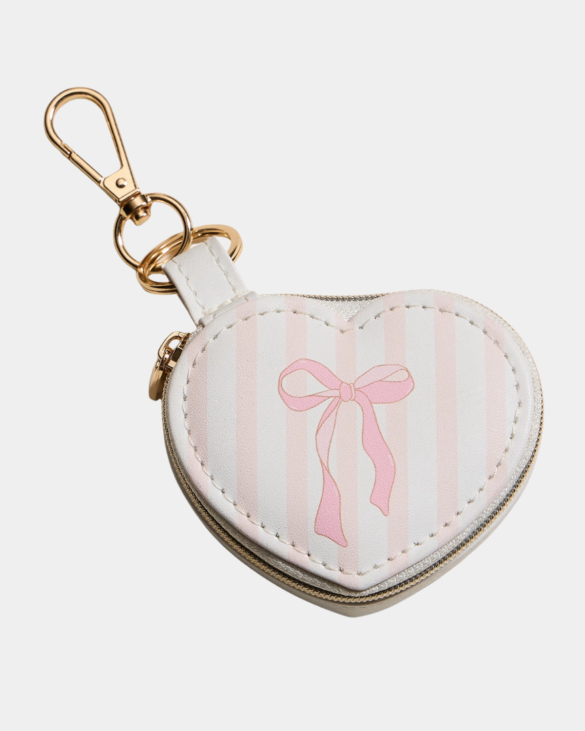 Keep your jewelry safe and stylish on the go with this heart-shaped case. Featuring a cute pink bow design and plush compartments for rings, earrings, and delicate pieces, it's the perfect compact companion for travel or daily adventures.