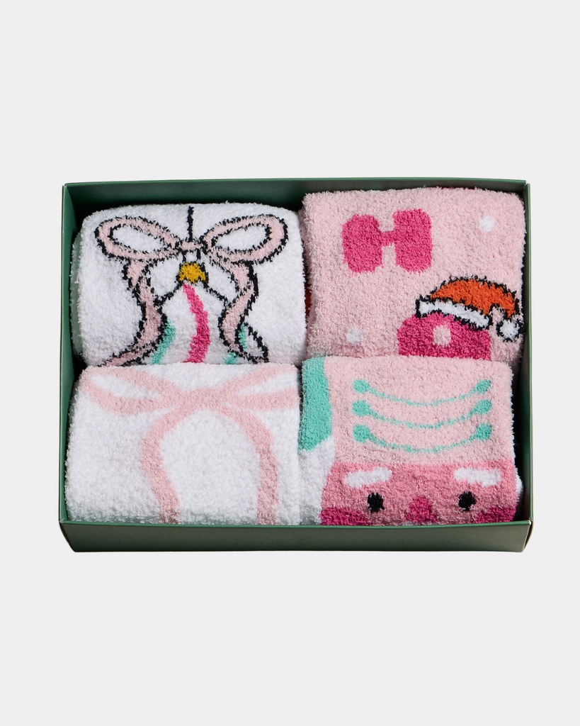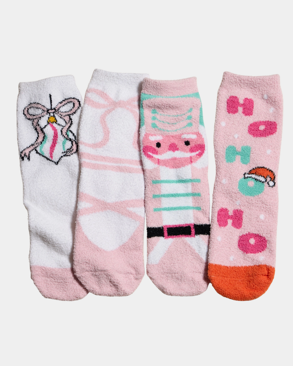 Get festive with this fun set of four fuzzy socks, featuring playful prints like Ho Ho Ho, Christmas ornaments, nutcrackers, and ribboned shoes. Perfect for cozying up and spreading holiday cheer.