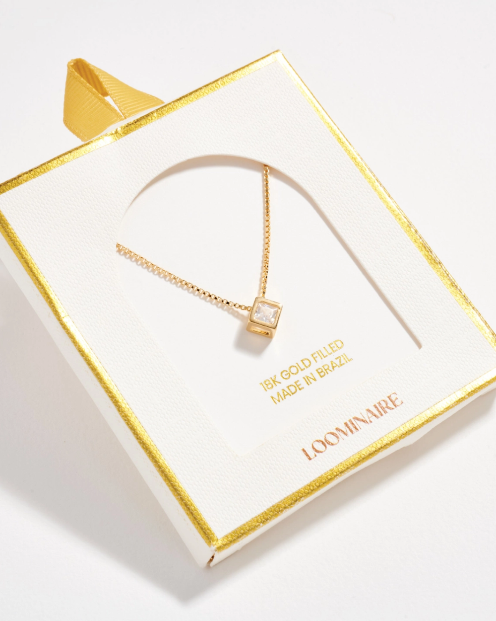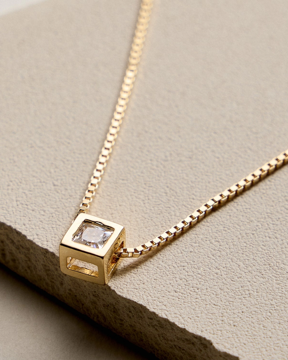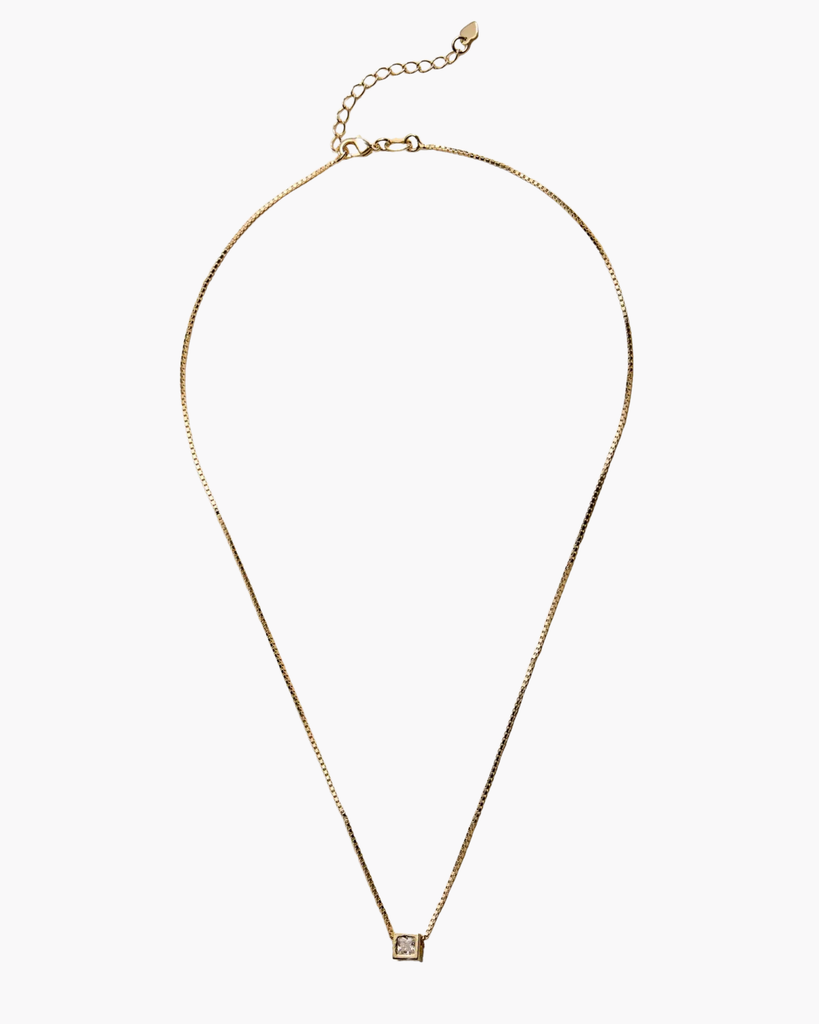 A refined gold-filled necklace featuring a polished box chain and geometric cube pendant with a luminous center stone. Its clean, understated design transitions effortlessly from everyday elegance to layered styling.